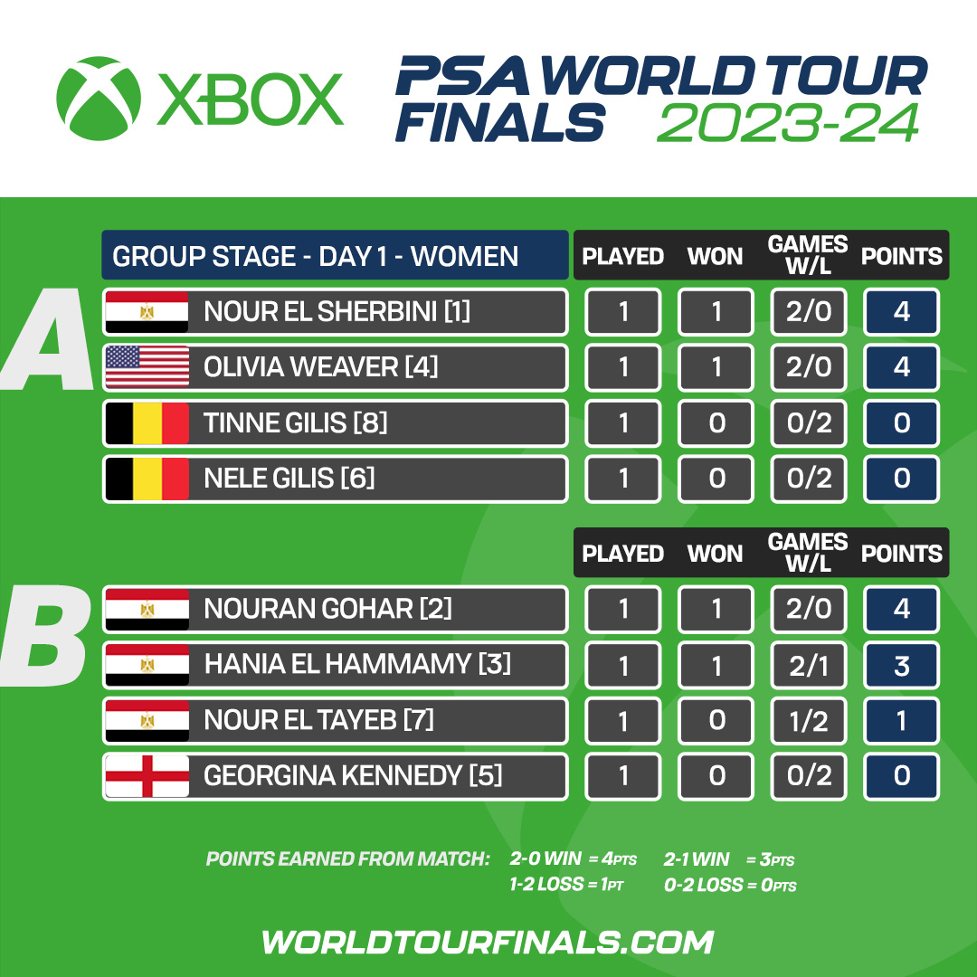 World No.1 Nour El Sherbini tops Group A, level on points with US No.1 Olivia Weaver after they beat Belgian sisters Nele and Tinne Gilis.