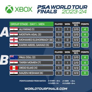 World No.1 Ali Farag – who is yet to win the PSA World Tour Finals – currently tops Group A on four points after beating 2018-19 winner Karim Abdel Gawad 2-0. Reigning men’s champion Mostafa Asal is in second after a win over two-time winner Mohamed ElShorbagy by the same scoreline. Asal is behind Farag due to Farag having a higher percentage of points won during his match.