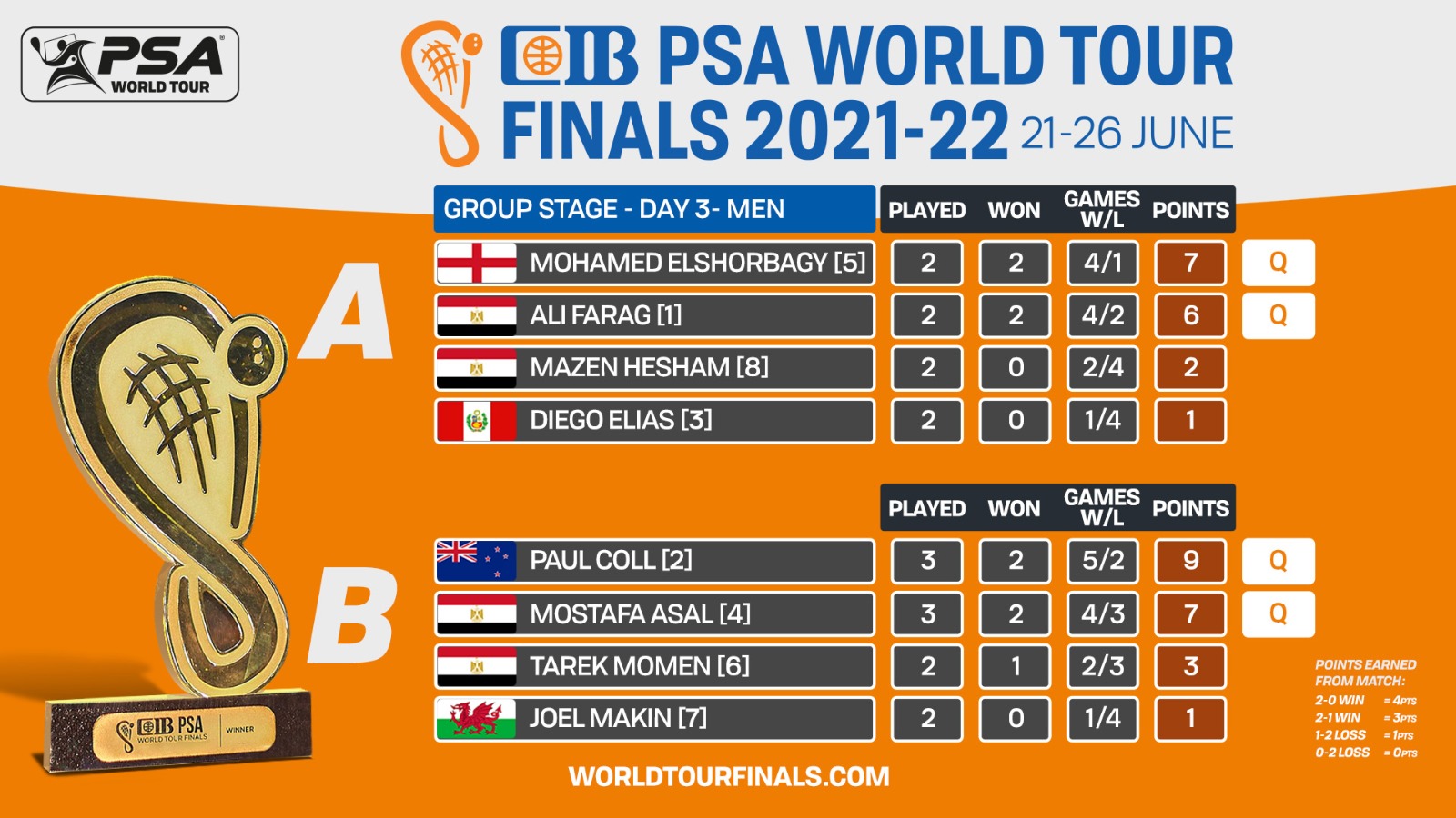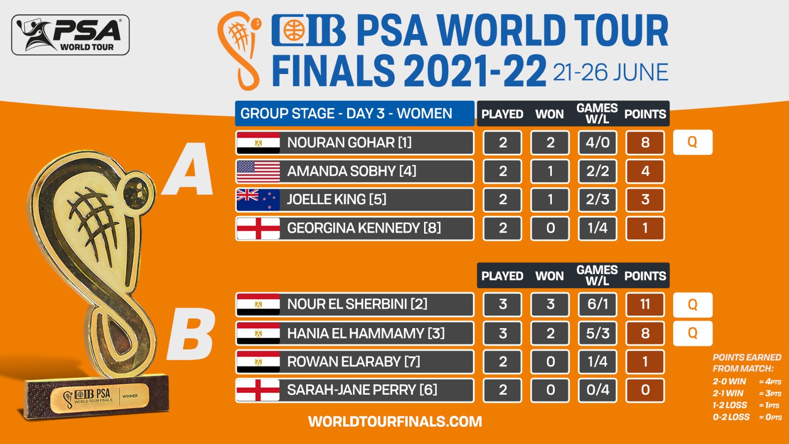 The group stage of the CIB PSA World Tour Finals concludes today, as the tour’s top players compete to reach the semi-finals at the Mall of Arabia in Cairo.