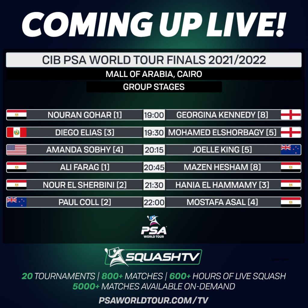 It’s day three of the CIB PSA World Tour Finals, and we have six matches on tonight’s slate at the Mall of Arabia in Cairo, as the final event of the season continues, and places in the semi-finals will get taken.