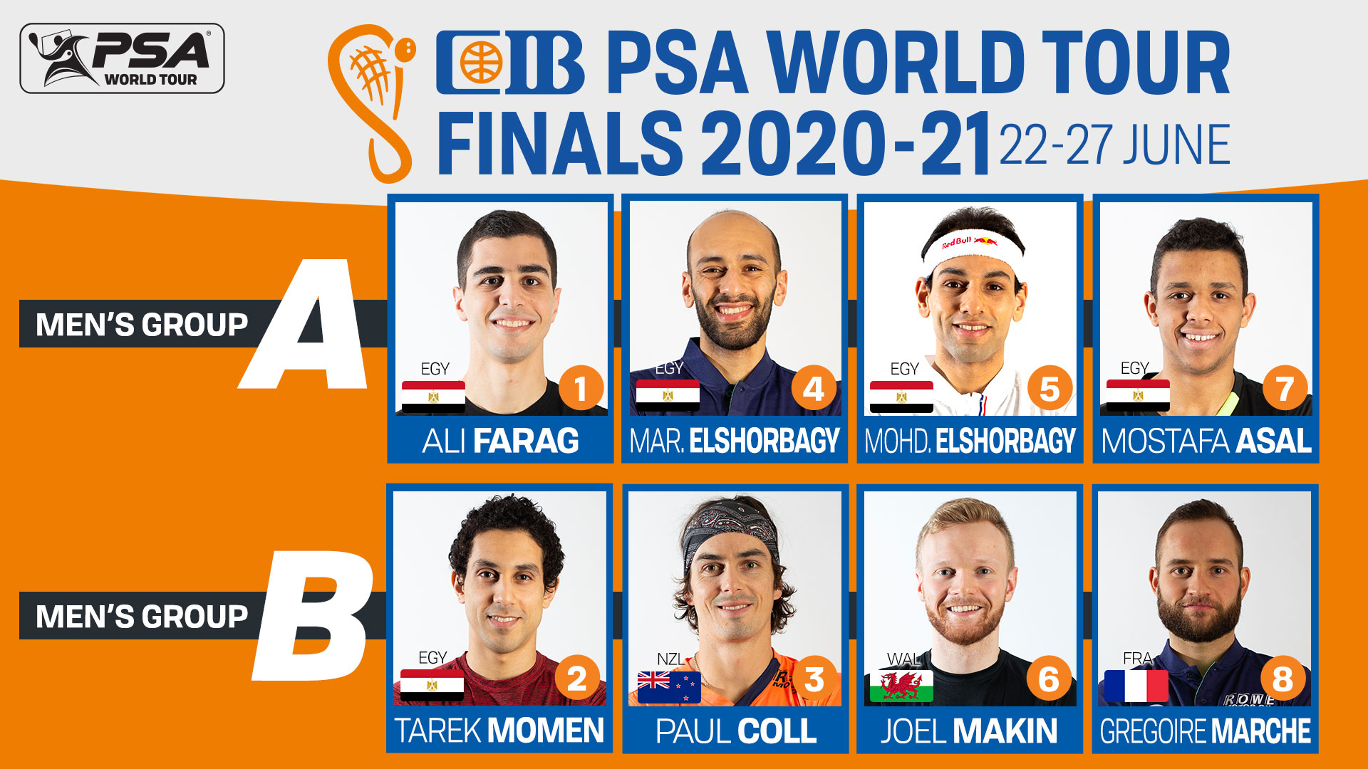 The women’s groups remain unchanged. World No.1 Nour El Sherbini heads up Group A alongside World No.2 Nouran Gohar, World No.4 Camille Serme and World No.9 Salma Hany.