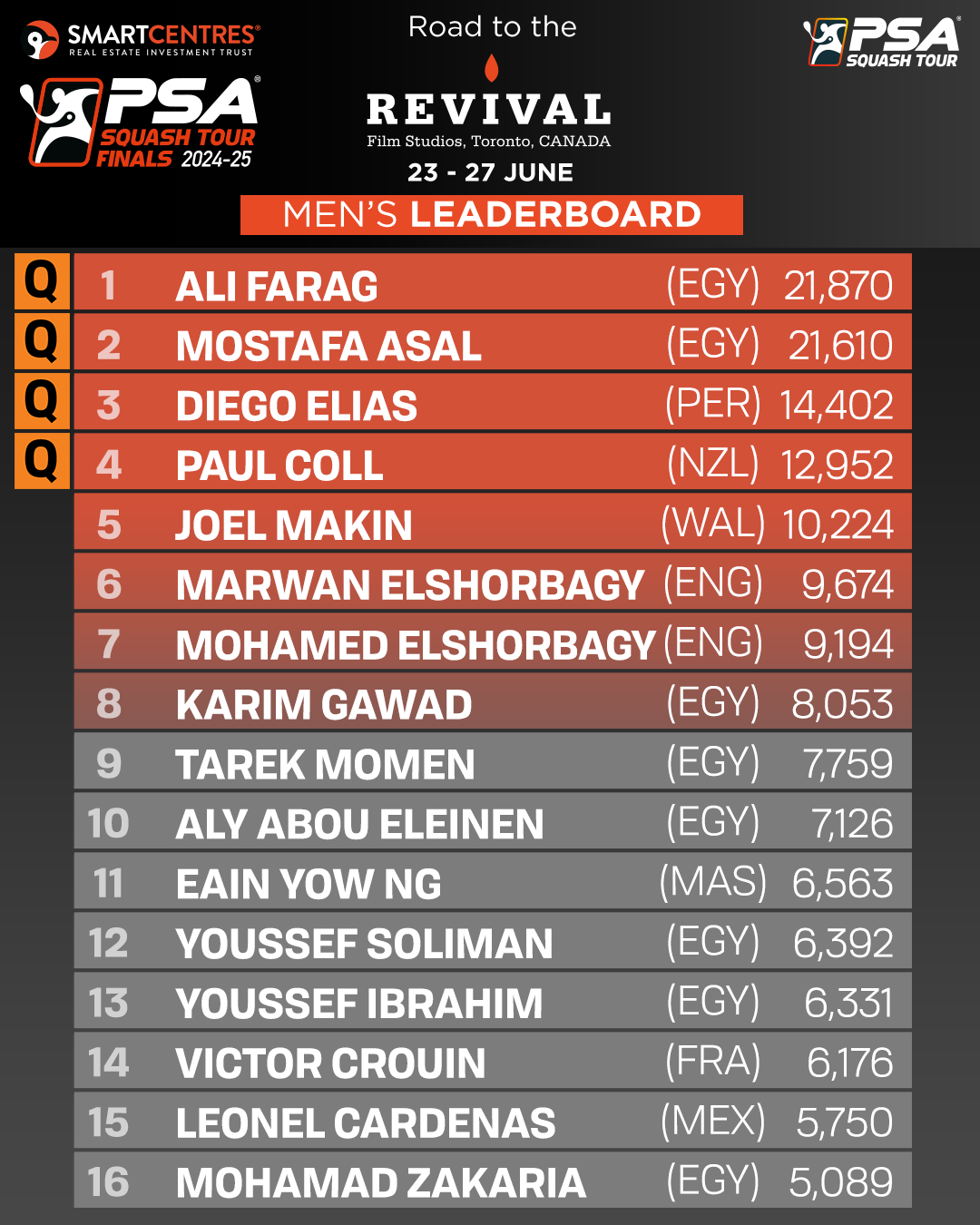 El Hammamy, Elias, Weaver & Coll Qualify For SmartCentres PSA Squash Tour Finals 2024-25
