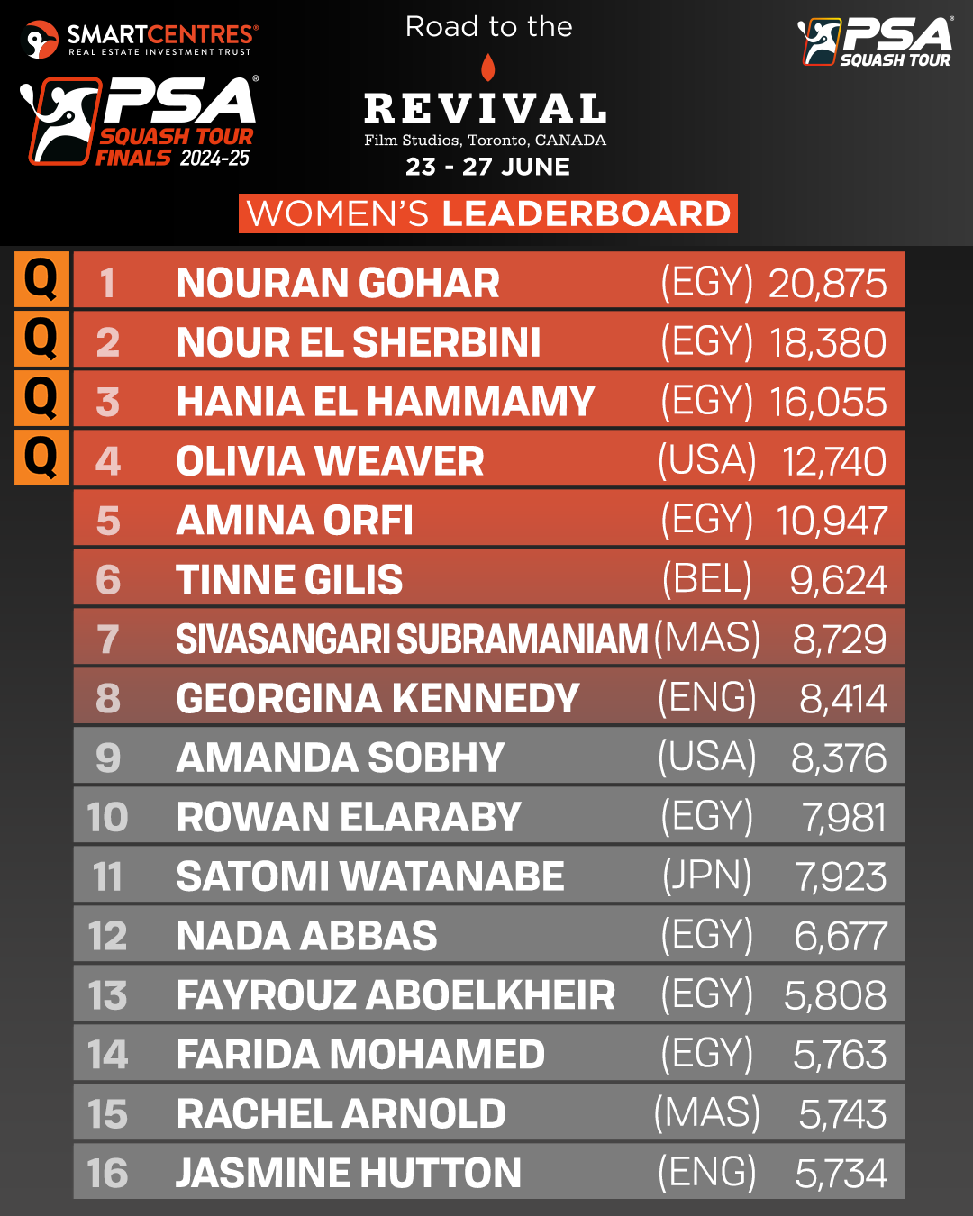 United States No.1 Olivia Weaver is the final player to have booked her flight to Toronto via her current points total, with the World No.4 sitting on 12,740 points in the latest Road to Tour Finals leaderboard. The 29-year-old came within a game of defeating eventual champion El Sherbini in the semi-finals of the PSA World Championships but eventually lost out in a tough five-game duel.