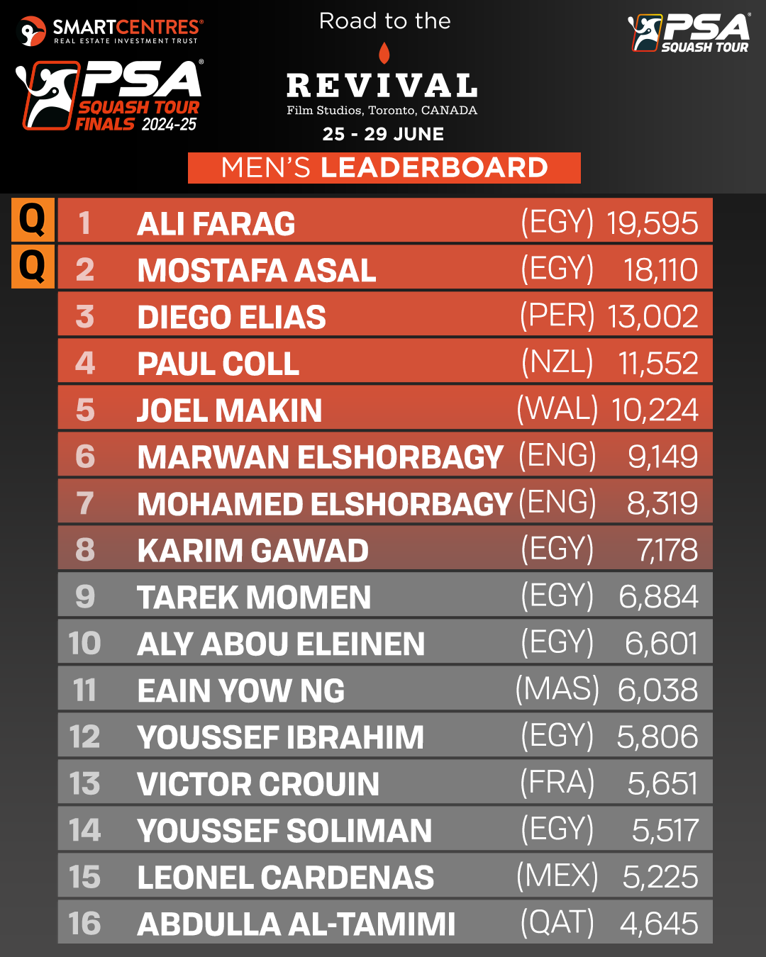 The pair join Egyptian Open champions Mostafa Asal and Nour El Sherbini as the only players to have so far booked their spots in the season-ending SmartCentres PSA Squash Tour Finals.