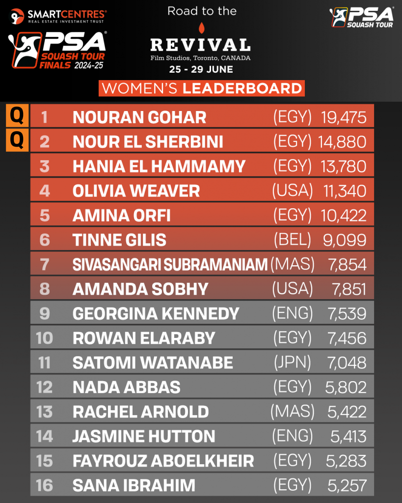 It is a similar case for Women’s Grasshopper Cup champion Nouran Gohar, whose total of 19,475 is out of reach of anybody currently beneath the top eight automatic qualifying positions.