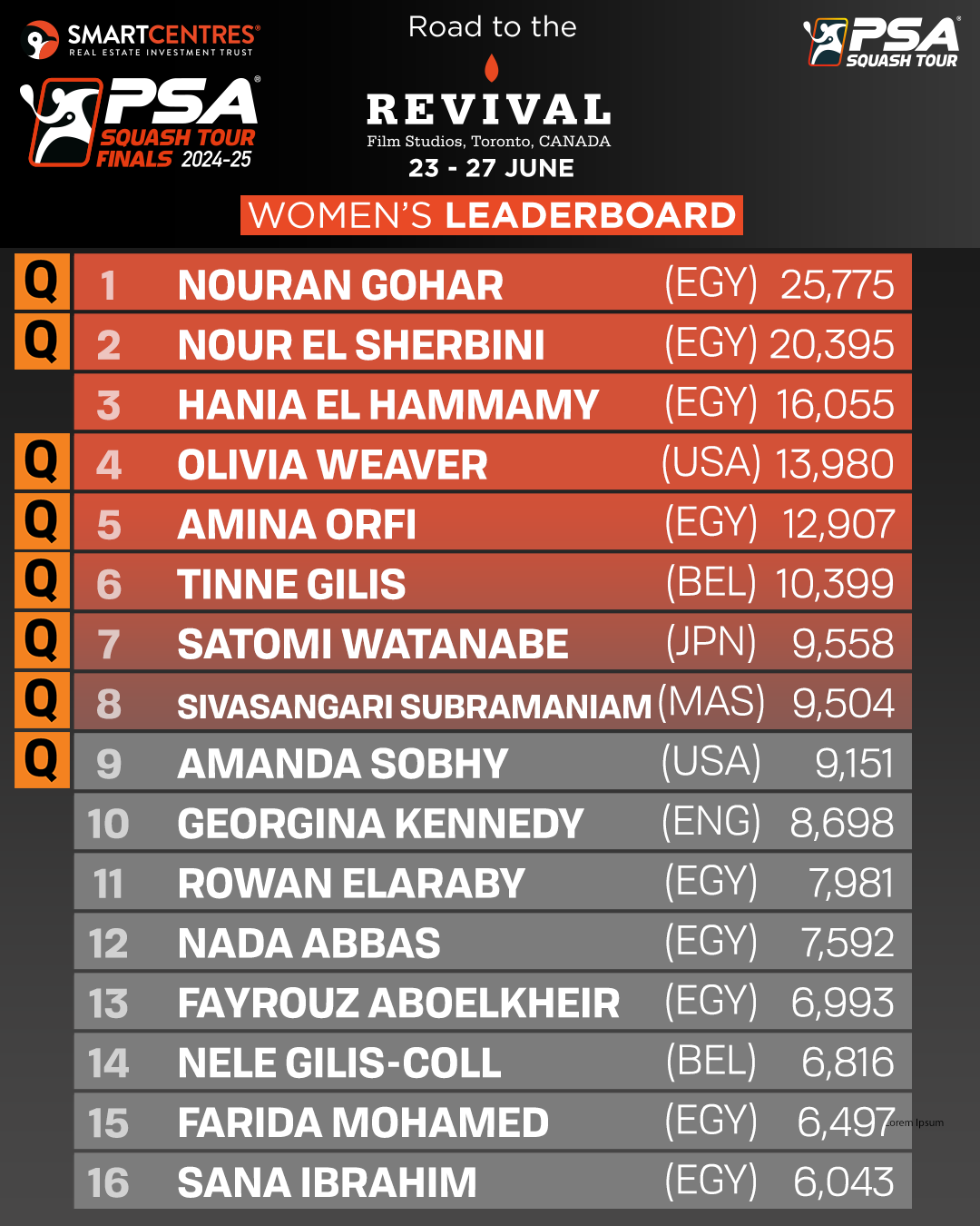The four players will join Nouran Gohar, Nour El Sherbini, Olivia Weaver and Amina Orfi in competing for the season-ending silverware at the SmartCentres’ Revival Film Studios in Toronto between June 23-27, 2025.