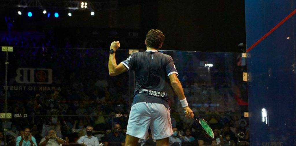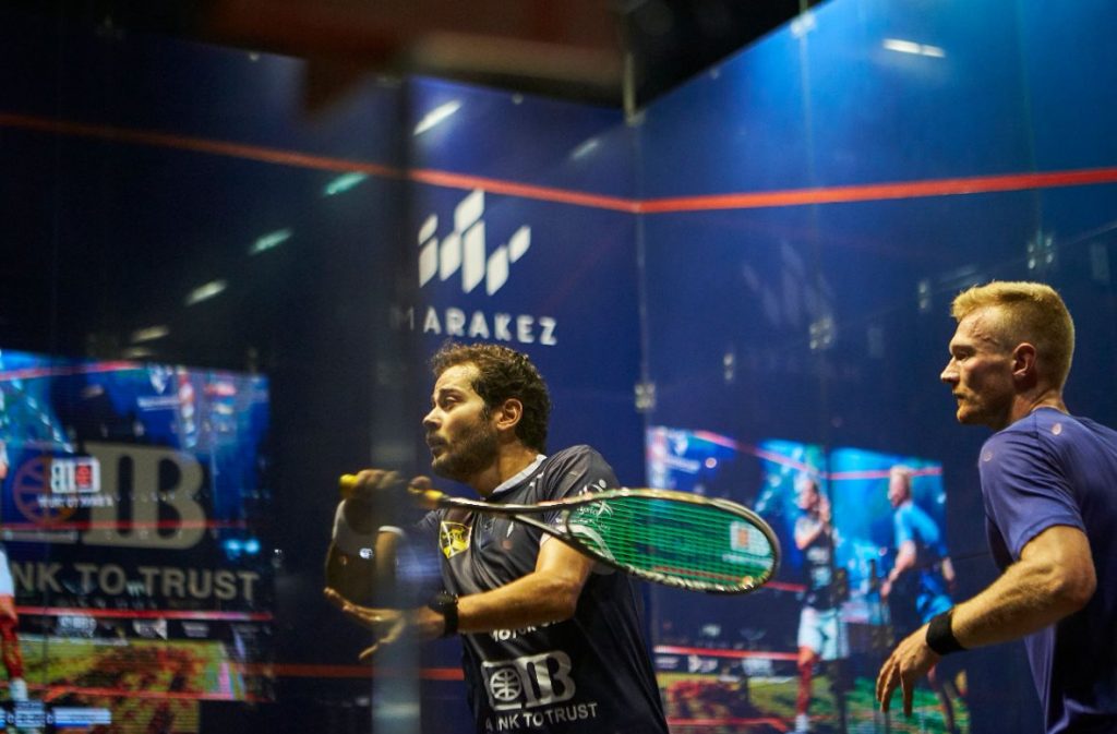 Karim managed to mind. From 4/0 down, we were back at 4/4, 5/5, 6/6. A string of beautiful combination from the Egyptian, who had to win the point again and again in every single rally, 10/7, taking the opener only just 11/9 with a superb backhand volley dropshot. 21m first game.