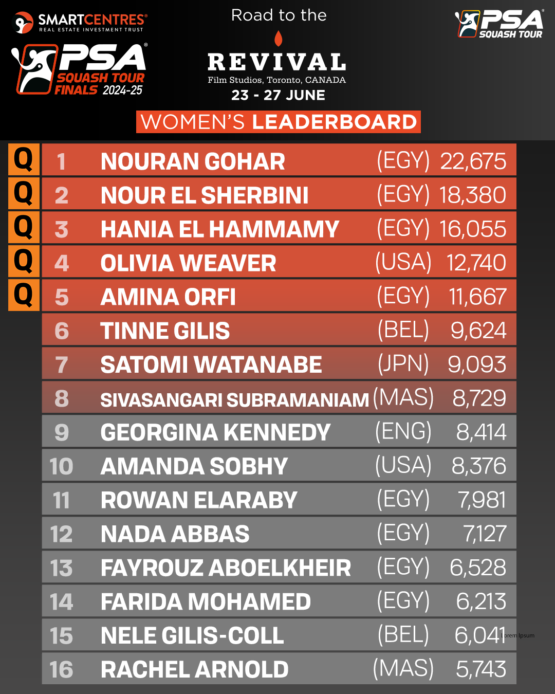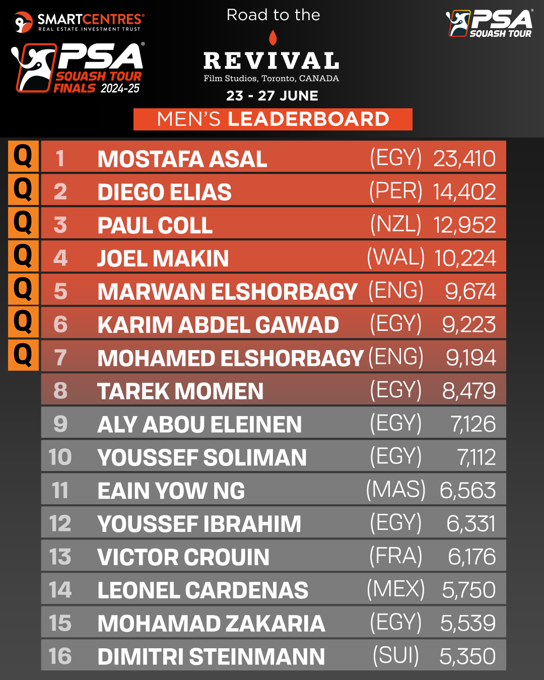 The SmartCentres PSA Squash Tour Finals 2024-25 will be held in Canada for the first time in the event’s history when SmartCentres’ Revival Film Studios in Toronto hosts the world’s leading squash players for five days, between June 23-27, 2025. Live action from the SmartCentres PSA Squash Tour Finals will be streamed via SQUASHTV, while the semi-finals and finals will be shown by the PSA’s broadcast partners.