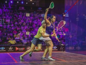 A super start from Salma “Glamour” Hany in the first game, able to keep Nouran under control by playing a height squash game, not too much pace, not too much weight on the ball, frustrating The Terminator who just couldn’t generate as much power as she normally likes.