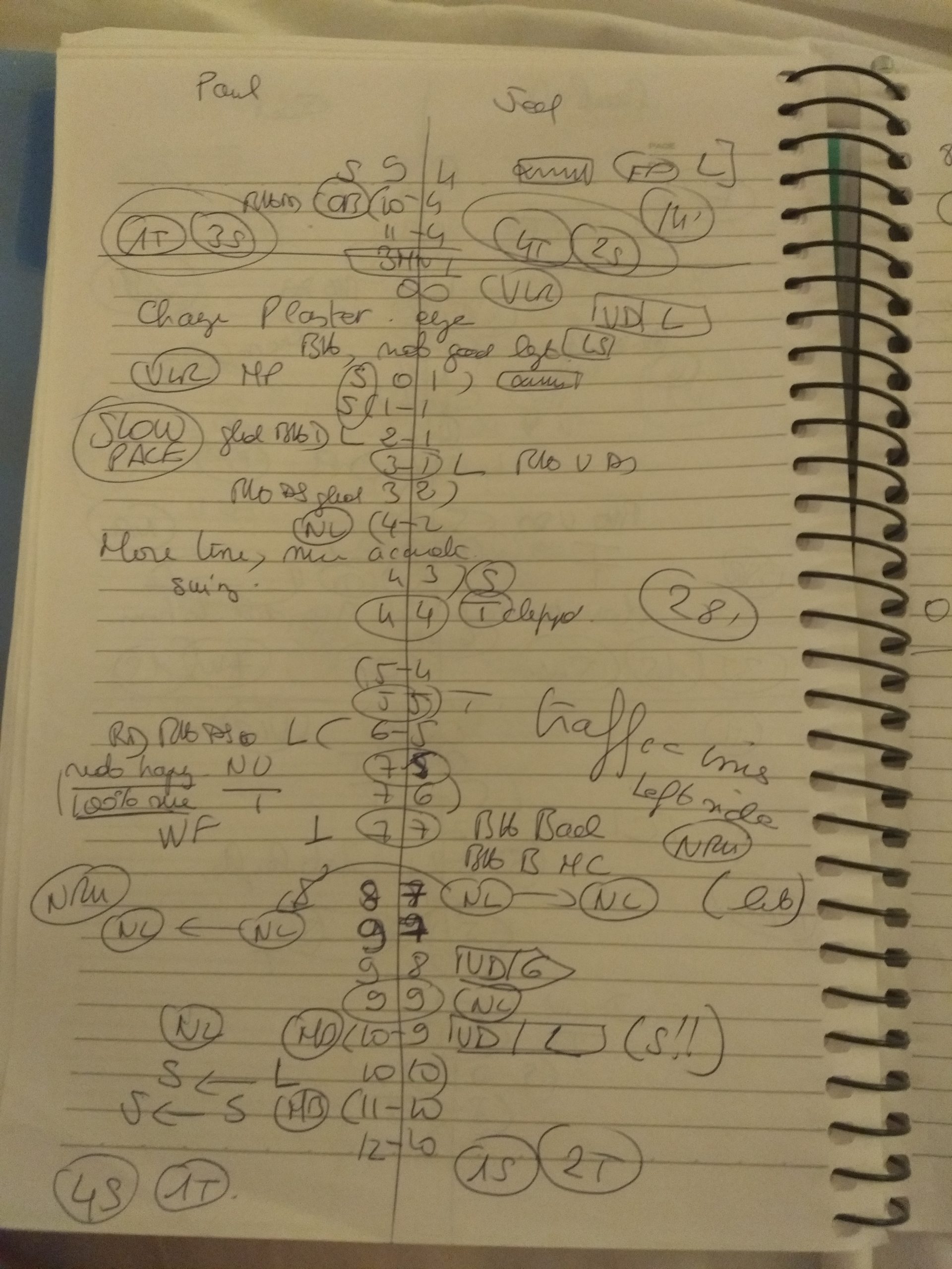 Complete reverse in the second, 5/1, 7/2, 9/3, 11/4 , 14m game, with 4 errors from Joel and 1 from Paul.