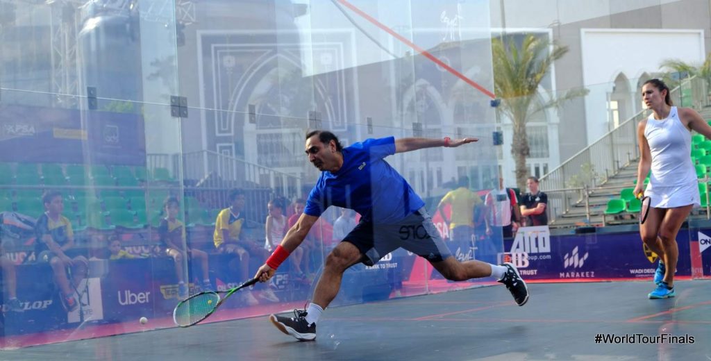 His training partner, in charge of the CIB Digital World – all to do with apps and all – Farhan Farooqi, played Joelle King and also Mohamed Shorbagy… Good day for you Farhan, hope you can move today!