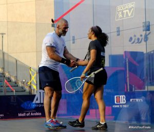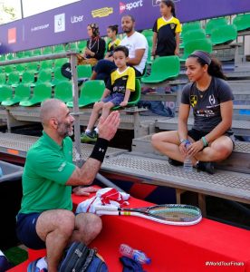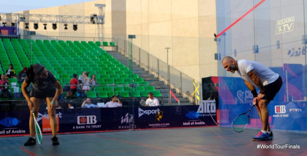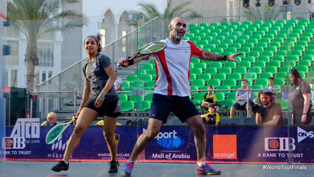 In this not too hot afternoon, Hussein Abaza, “Godfather of Egyptian Squash”, his nickname coming naturally to me as I was trying to encapsulate his role in Egyptian Squash, arrived 30m before the time he was supposed to play – showing how keen he was to play with his idol – his words, not mine – Raneem El Welily.