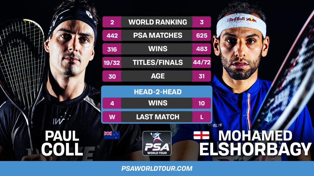 The last match of the evening will see New Zealand’s Paul Coll take on England’s Mohamed ElShorbagy for a place in the finals of the CIB PSA World Tour Finals, in what is their 15th meeting on Tour.