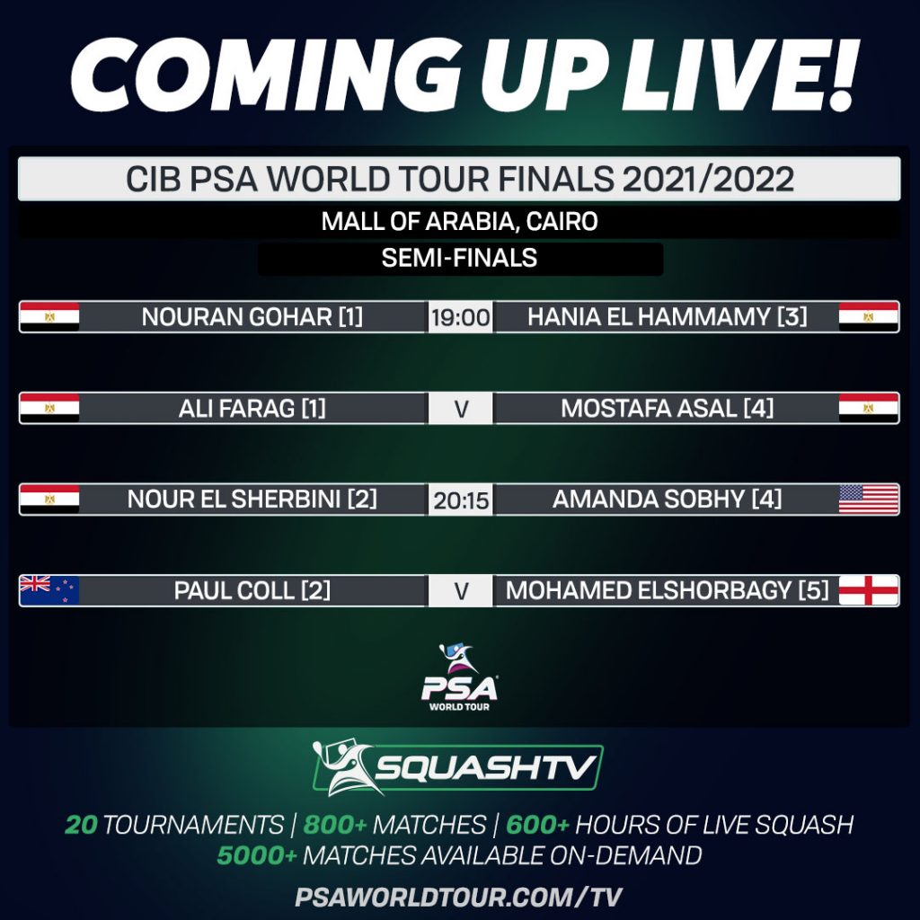 The semi-finals of the CIB PSA World Tour Finals take place today, with action beginning at 19:00 (GMT+2) at the Mall of Arabia in Cairo as the last four players on both sides of the tournament aim to reach the final of the season-ending competition.