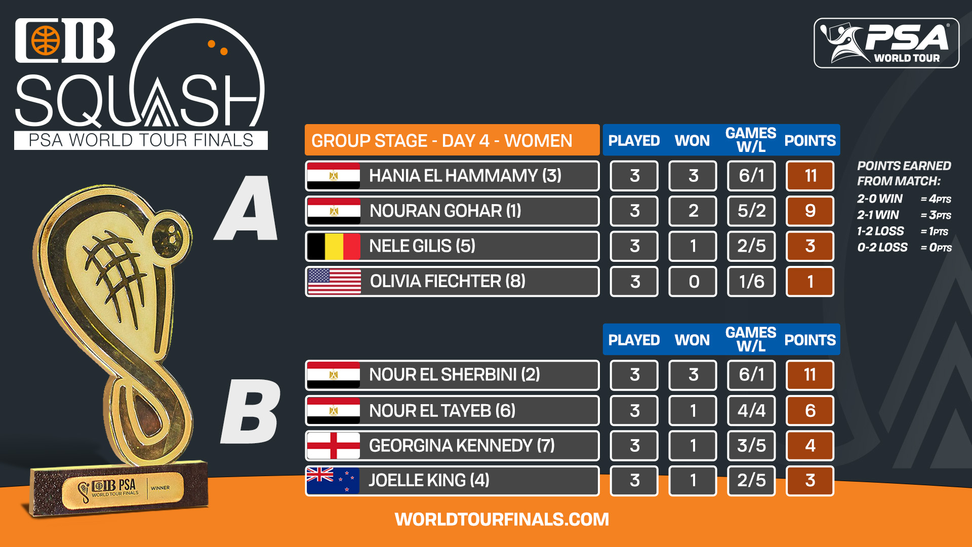 The battle for the remaining semi-final spot was a tense one with Nour El Tayeb, Georgina Kennedy and Joelle King all level after the three games on matches won and lost. Therefore, it was down to games won throughout the group stage matches and thanks to stealing a game off Elsherbini and Kennedy and then beating King 2-0 on the final day, El Tayeb claimed the place in the final four.