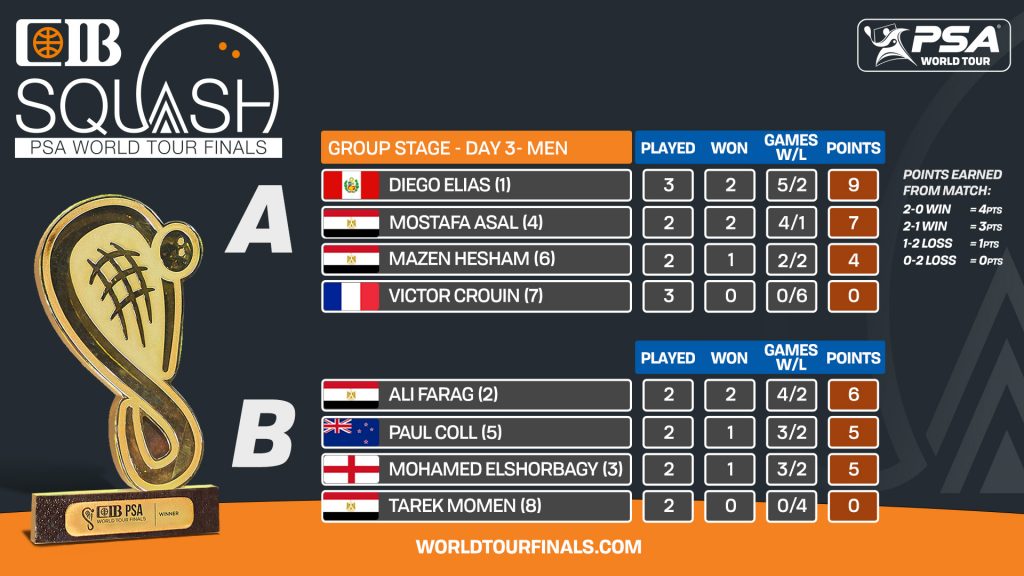 That display from the Peruvian means he sits on nine points, two ahead of No.4 seed Mostafa Asal despite his defeat to the Egyptian last night. Elias will finish top of Group A if Asal loses out to No.6 seed Mazen Hesham tomorrow, but Hesham will need to win 2-0 if he is to qualify at Asal’s expense.