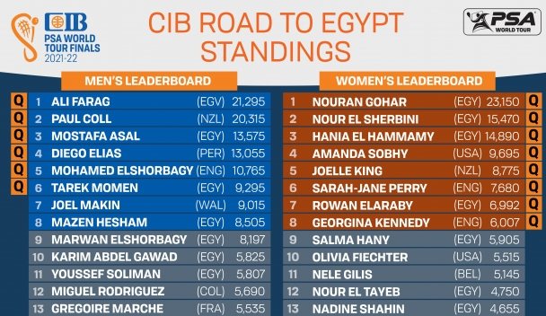 World No.1 Ali Farag leads World No.2 Paul Coll at the summit of the CIB Road to Egypt Standings, but the Kiwi can overtake the Egyptian if he reaches the final in Mauritius.